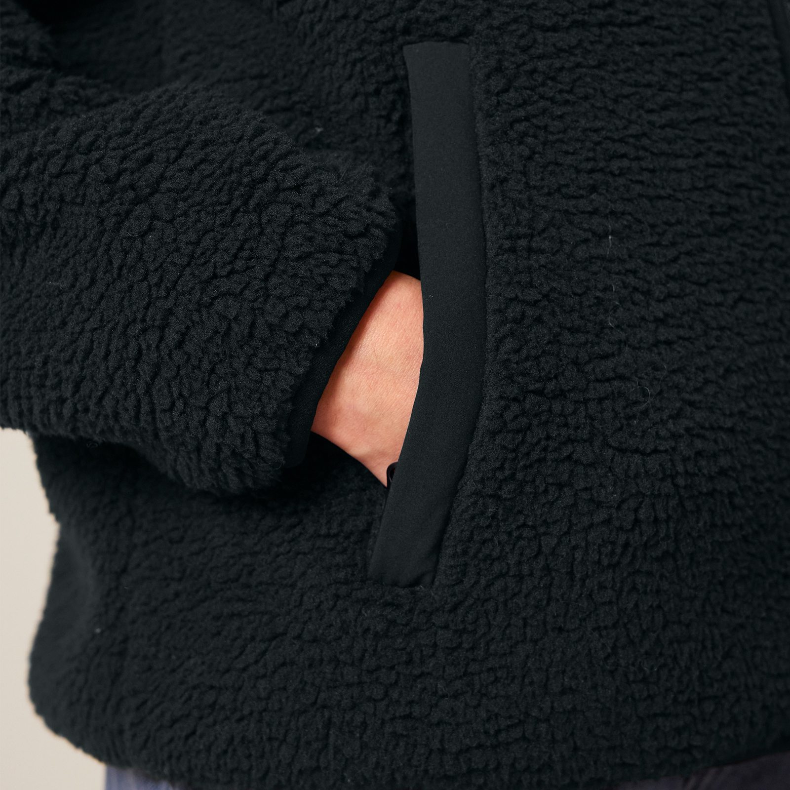 - Material exterior: Sherpa, 100% Poliester  Reciclat, Fabric washed, 450 GSM